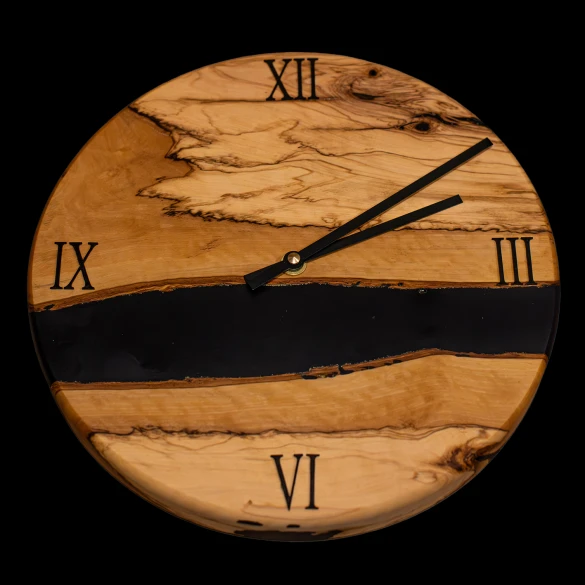 Wanduhr aus Olivenholz und schwarzem Epoxidharz